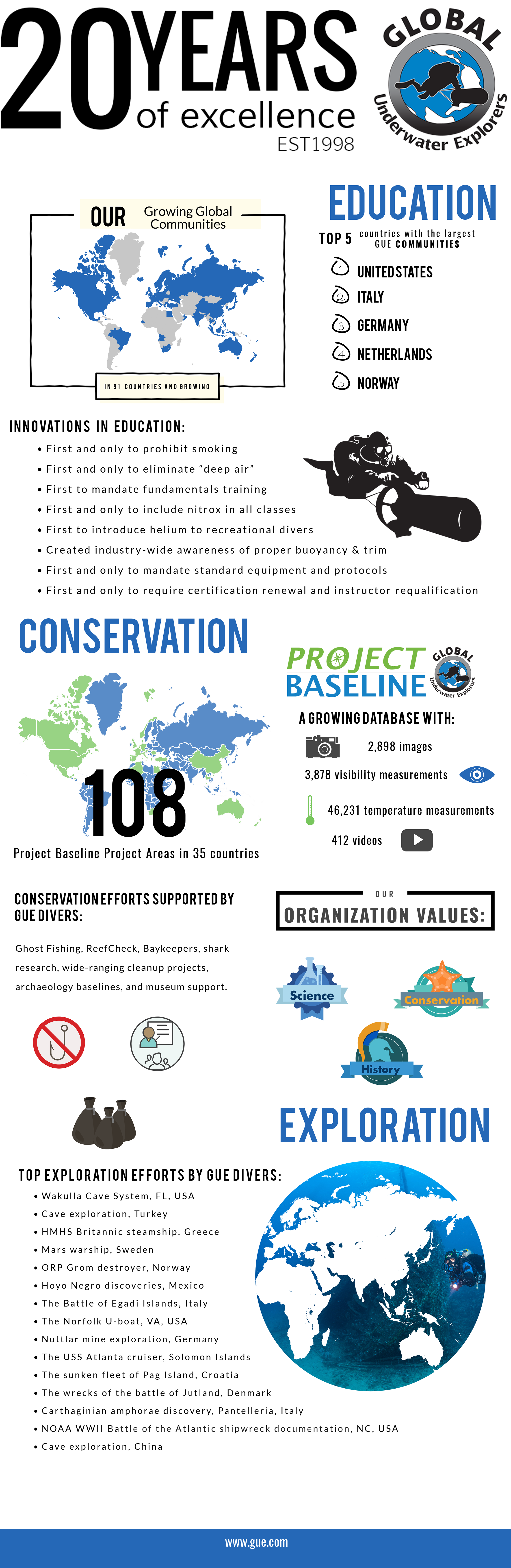 After two decades of teaching students, the GUE community has grown its presence to over 90 countries with more than 150 instructors. GUE divers have participated in projects in over 35 countries and worked with universities and researchers from around the world to explore, study, and document a full range of aquatic environments.